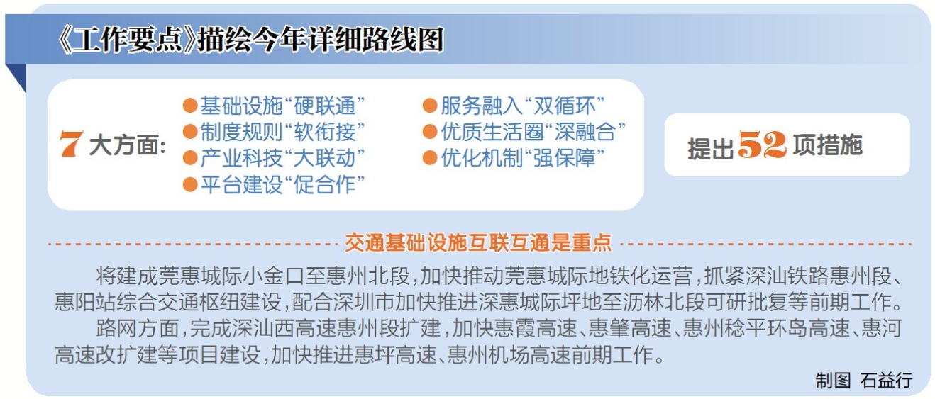 在大灣區,惠州如何進一步強化東部樞紐門戶地位?《工作要點》描繪了今年的詳細路線圖,聚焦基礎設施“硬聯通”、制度規則“軟銜接”、產業科技“大聯動”、平臺建設“促合作”、服務融入“雙循環”、優質生活圈“深融合”、優化機制“強保障”等七大方面,提出了52項措施,并明確了相應的責任單位進行落實。