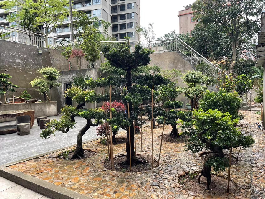 在村莊漫步,一戶庭院就是一處風景。村民胡仁軍家門前的一株羅漢松造型獨特,推門入戶,發現別有洞天。胡仁軍在房子一側錯落有致地種滿了羅漢松和簕杜鵑等植株,青翠間點綴著殷紅,粗略估計院子里有上百棵植物。