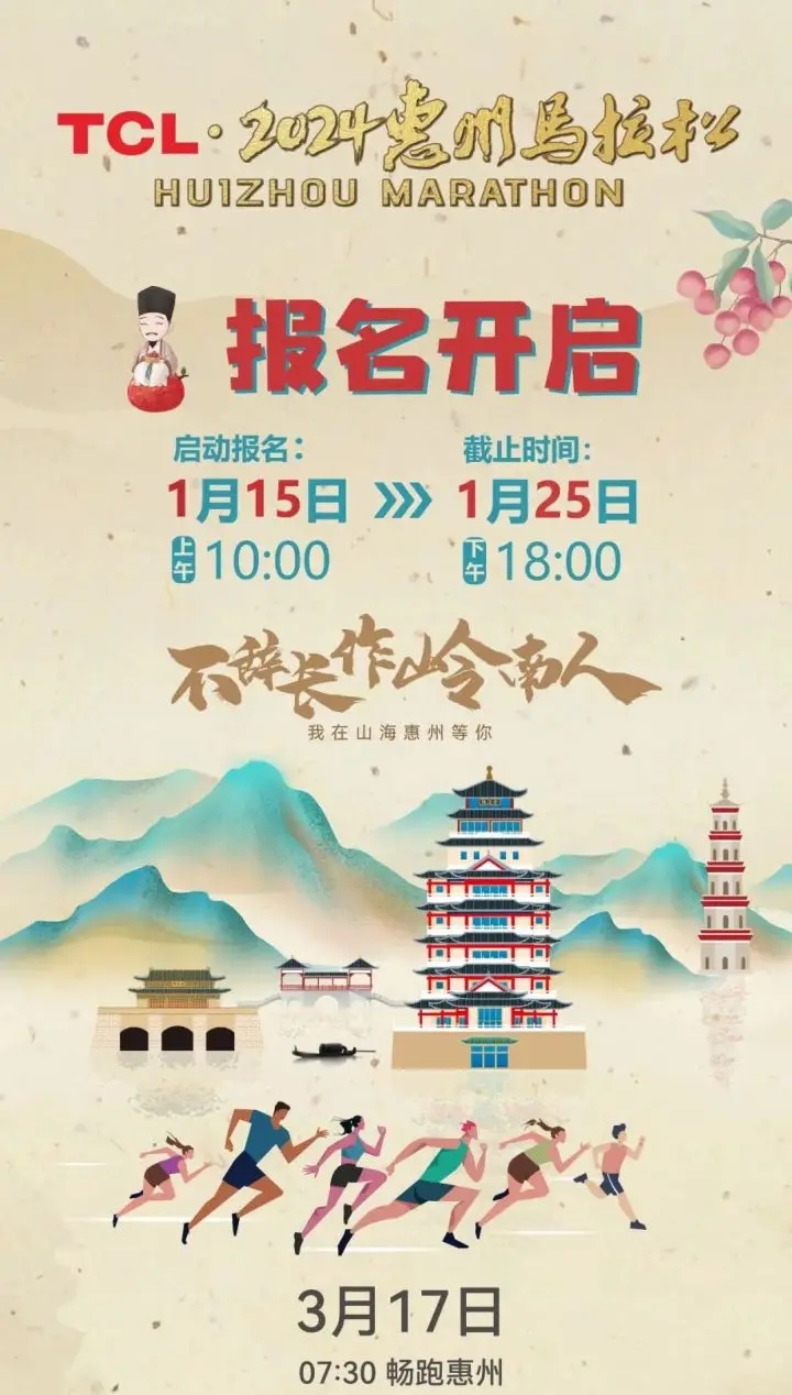 暢跑山海惠州,品味東坡文化!TCL·2024惠州馬拉松將于3月17日7點30分在惠州體育館(云山西路)鳴槍起跑,賽事報名將于1月15日10點開啟。