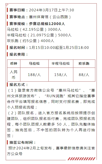 選手可從賽事官方微信公眾號“惠州文體旅游發布”進入報名系統填寫報名信息,完成報名。或在官方合作APP馬拉馬拉或數字心動注冊并報名。抽簽結果預計將于2024年2月上旬公布。