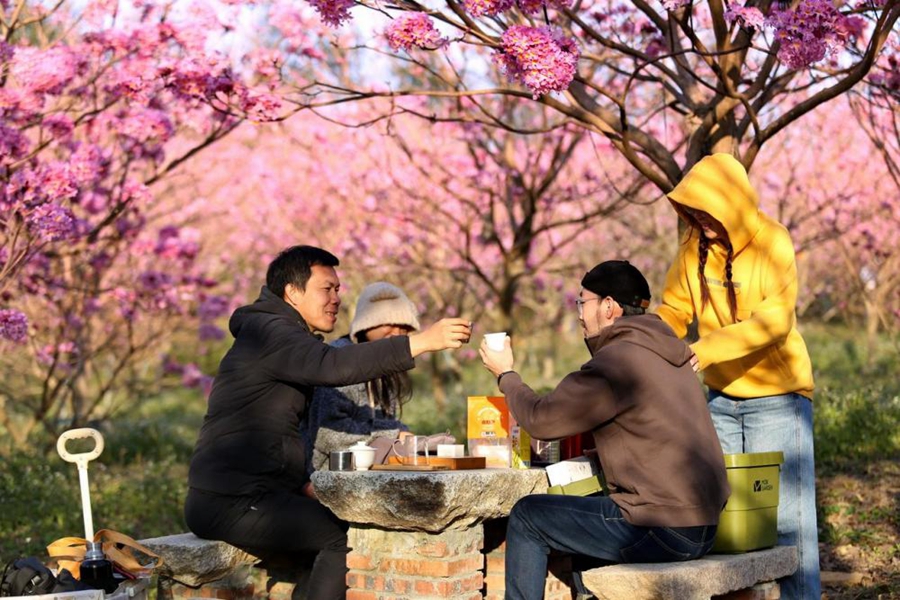在江門市新會區大澤鎮山頭坪,游客在花海中泡茶(2023年1月29日攝)。新華社發(黃繼明攝)