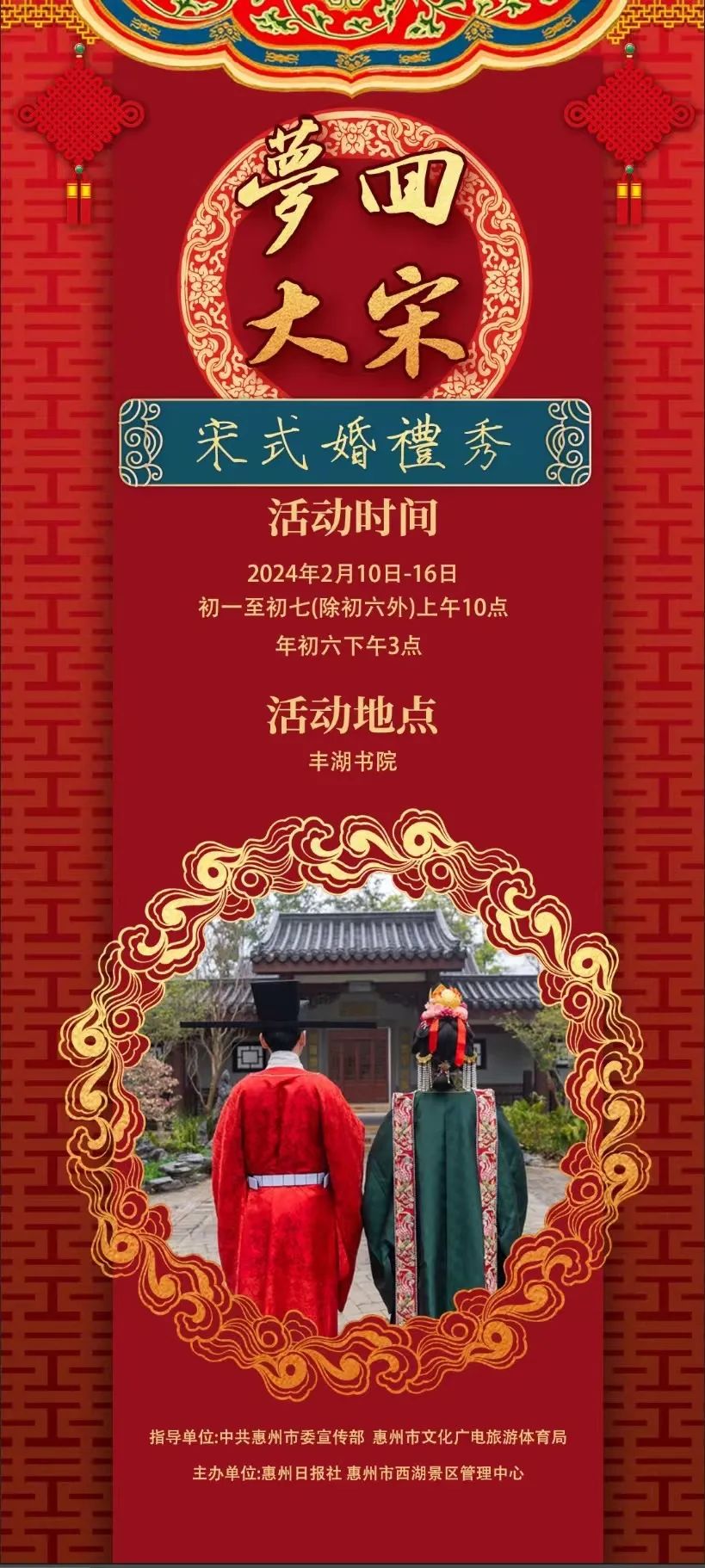 “羅浮山下四時春”——嶺南書院·豐湖書院春節主題活動,將于2月10日-2月16日(正月初一至初七)在惠州西湖景區豐湖書院舉辦本次主題活動分為“宋式婚禮”“宋街”兩大板塊,帶你一起夢回大宋,在“穿越之旅”中沉浸式體驗千年前的北宋盛況。