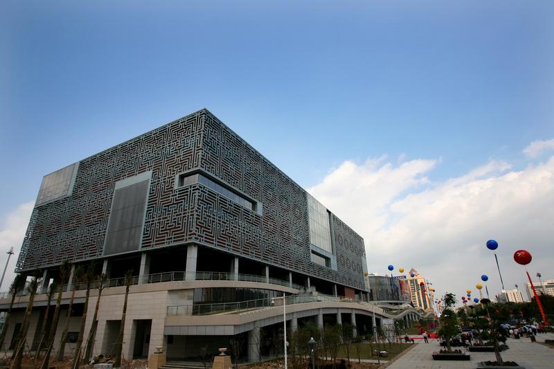 惠州博物館外觀設計象征“歷史之印”,大量使用先秦時期東江流域出土的陶器網格紋元素作為裝飾,厚重而典雅。