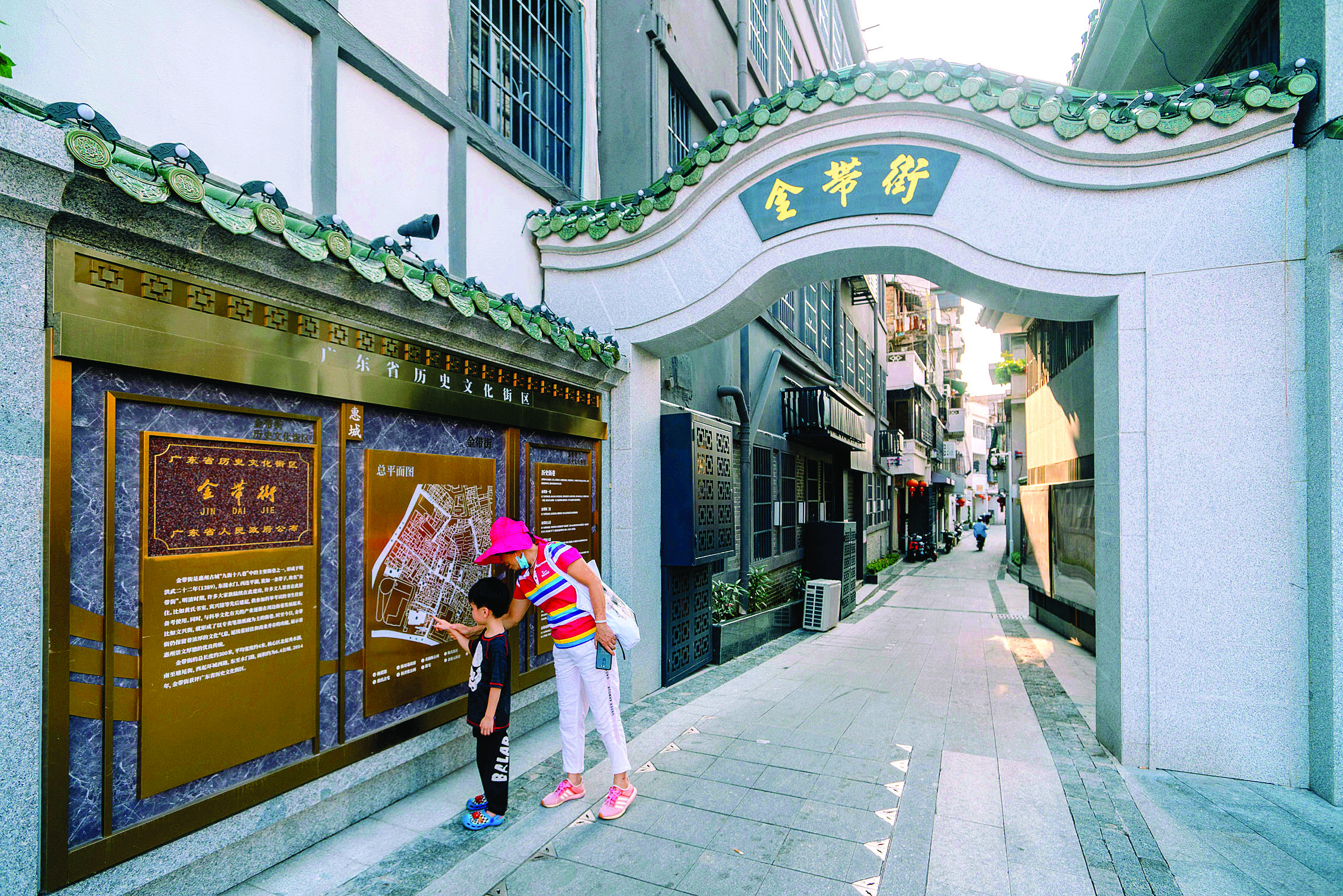 整治提升后,金帶街以灰、白為主要色調(diào)統(tǒng)一沿街建筑風(fēng)貌,主街路面鋪設(shè)青石板,根據(jù)以往門樓線條重建東、西新門樓,結(jié)合金帶街文化,改善居民生活空間,讓歷史文化與現(xiàn)代生活融為一體。與金帶街隔江相望、因水而興的水東街(二期),也在微改造中重現(xiàn)嶺南騎樓風(fēng)情,并通過銅雕、老字號(hào)招牌等元素還原明清時(shí)期水東街繁盛的商埠文化,留住城市記憶。
