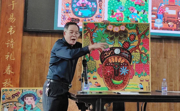 講座中,王漢池講述了龍門農民畫的發展歷史、繪畫技巧和主要成就,他以自己的作品《客家山歌農民畫組畫》為例,闡述龍門農民畫是一種隨著時代發展而不斷創新發展的畫種,充滿藝術張力和生命力。