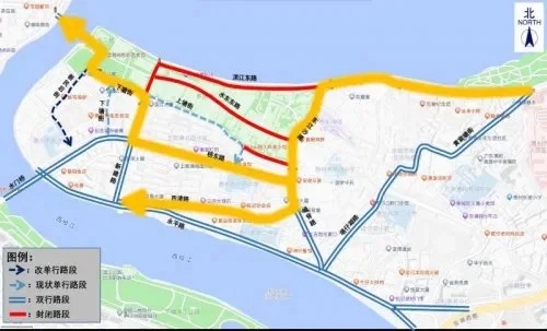 (二)濱江東路/黃家塘街交叉口至濱江東路/東江沙路交叉口路段,調整為車輛東往西單向通行。