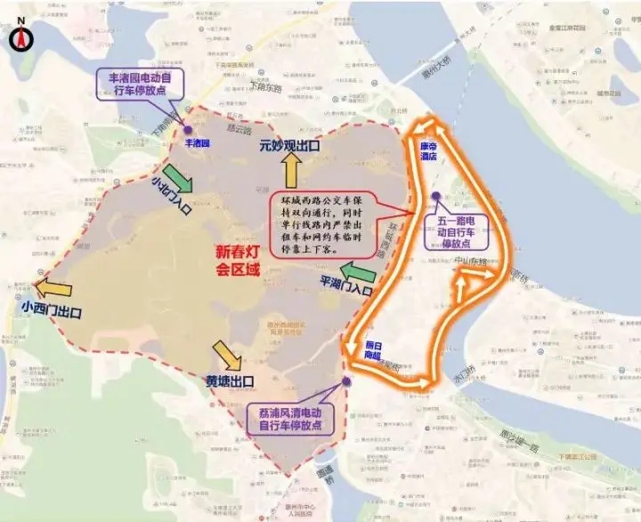 (三)燈會亮燈期間出入口實行安保管制,觀燈入口為平湖門、小北門(只進不出),陳公堤入口只可進入至豐湖書院,觀燈出口為小西門、元妙觀、黃塘崗(只出不進),現場指揮部根據觀燈人流情況臨時管制。