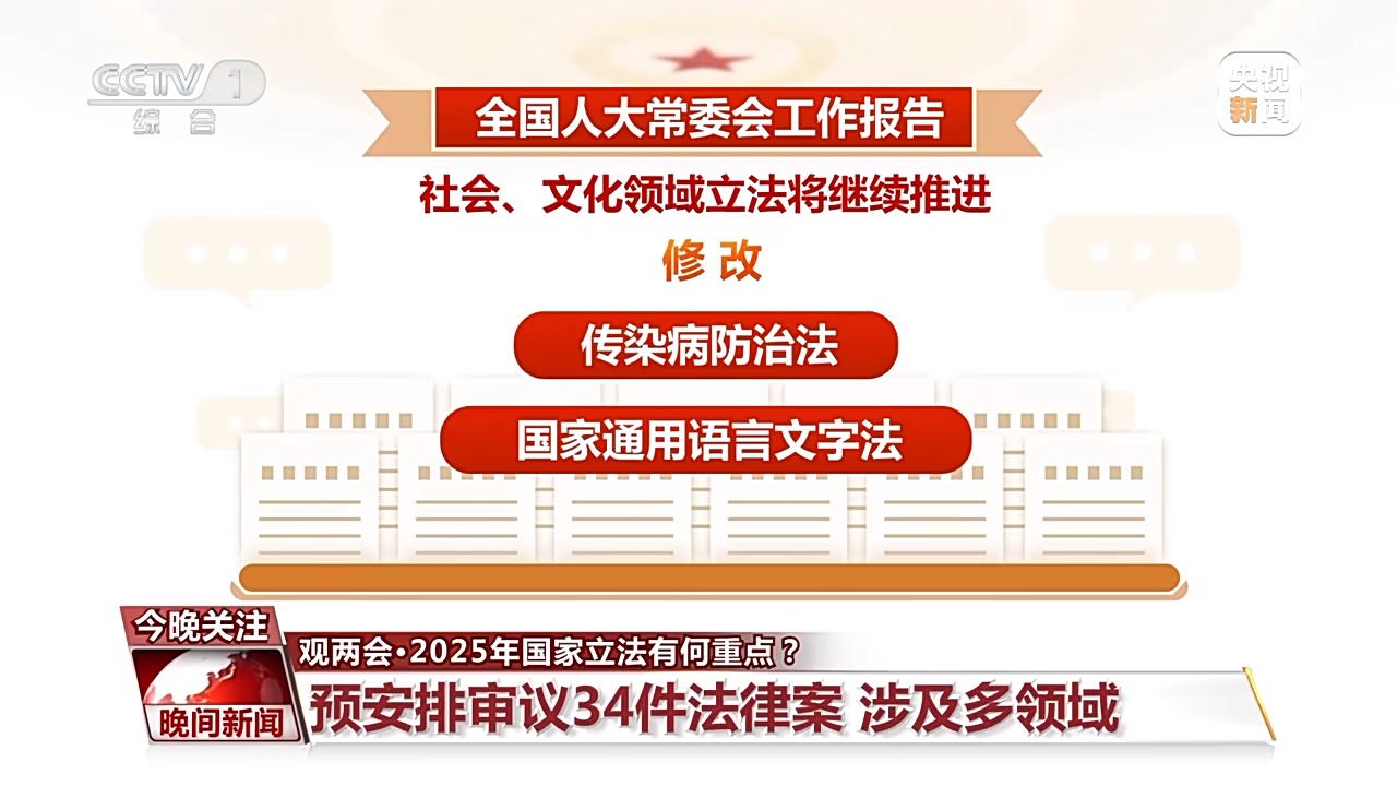 社會(huì)、文化領(lǐng)域立法將繼續(xù)推進(jìn),2025年將制定法治宣傳教育法、社會(huì)救助法、托育服務(wù)法檢察公益訴訟法,修改傳染病防治法和國家通用語言文字法。
