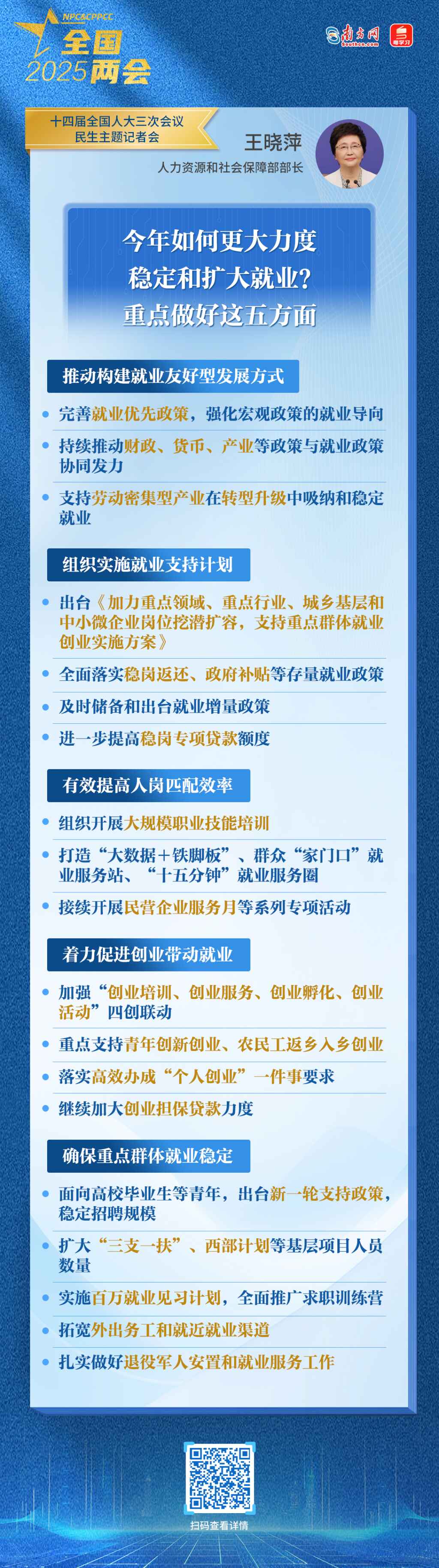 王曉萍補充,就業是家事,更是國事,今年政府工作報告明確經濟增長5%左右的預期目標,體現了穩就業、惠民生的需要。明確城鎮調查失業率5.5%左右、城鎮新增就業1200萬人以上的就業目標,體現了更大力度穩定和擴大就業的要求,重點做好五個方面的工作: