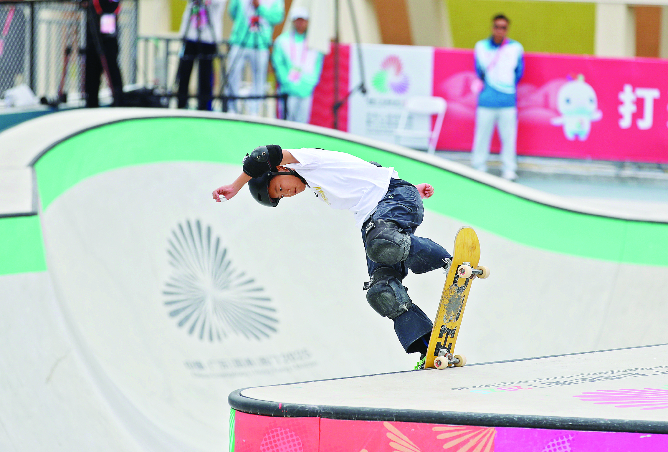 “宋昂媞,加油!”“融融,快樂滑板,享受比賽!”“全力以赴,融耀賽場”……看臺上,10余人的親友團舉著標語、高聲吶喊,為場上年齡最小的選手——9歲零5個月的四川代表隊運動員宋昂媞助威。宋昂媞的爸爸介紹,女兒從6歲起接觸滑板,至今已堅持3年,這是他們第二次來廣東,“一踏入這座城市,就被濃厚的十五運會氛圍包裹著!彼锌瑥臋C場的志愿者貼心指引入住路線、講解乘車攻略,到城市里隨處可見的賽事元素,都讓人倍感溫暖,“廣東的包容性和細致服務,給我們留下了深刻印象。”談及賽后計劃,他笑著說,一家人要好好逛逛廣東,品嘗地道美食,感受嶺南風情。