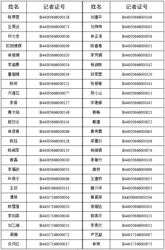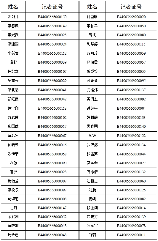 根據《新聞記者證管理辦法》的有關規定,按照《國家新聞出版署關于開展2023年度新聞記者證核驗工作的通知》、《廣東省新聞出版局關于開展2023年度新聞記者證核驗工作的通知》精神,我社對通過2023年度新聞記者證核驗人員名單(包括惠州日報134人和東江時報53人,共計187人)進行公示,名單如下:
