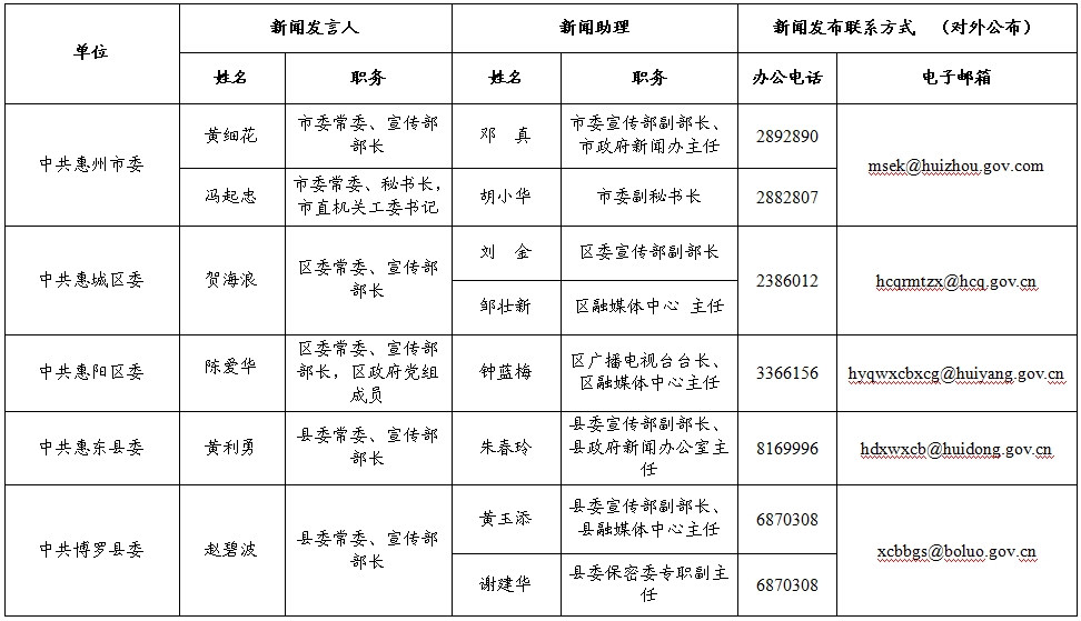 2024年惠州市黨委新聞發言人和新聞助理名單
