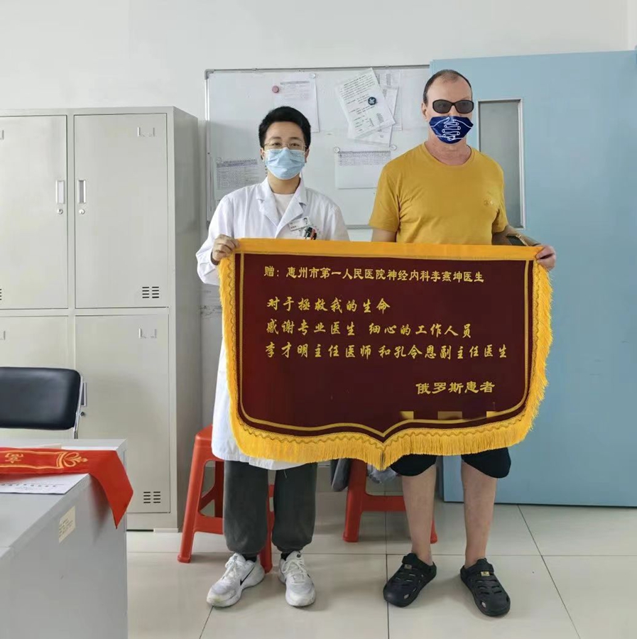 “謝謝你們救了我的命!”近日,一位來(lái)自俄羅斯的中年男子特地帶著錦旗來(lái)到惠州市第一人民醫(yī)院(以下簡(jiǎn)稱“市一院”)神經(jīng)內(nèi)科,感謝他們兩次挽救了他的生命。