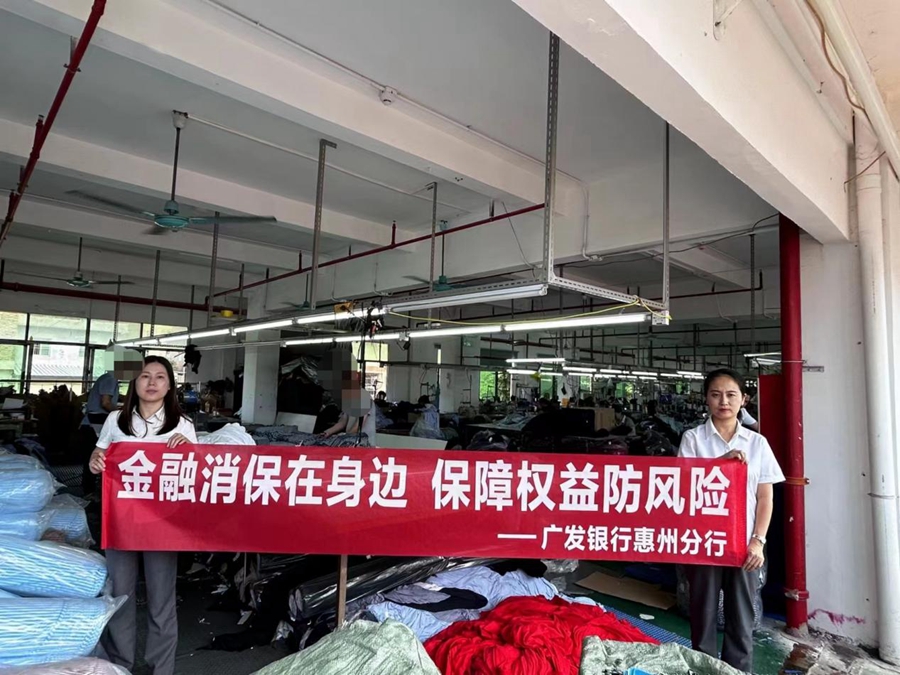 為充分展示金融消保新擔當、新氣象,廣發銀行惠州東平支行延伸服務半徑,深入惠州市捷航紡織有限公司,針對金融基礎弱、獲教渠道少的工人群體開展“金融消保在身邊 保障權益防風險”宣傳活動。