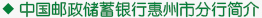 郵儲銀行惠州市分行自2007年12月成立以來,致力于“普惠金融”,服務三農、服務中小微企業、項目貸款和大型企業融資貸款申請,融入和支持地方經濟建設。郵儲銀行充分發揮網點眾多的優勢,以“服務社區、服務三農、服務中小企業”為宗旨,形成了“申請簡單,放款快速;陽光貸款,不收雜費;貸款成數高,循環使用;創新服務、貼近生活;貸款方式靈活”的信貸業務服務特色,建立起完善的金融服務體系。到目前為止,郵儲銀行惠州市分行在全市有服務網點85個,自助設備363臺,累計在惠州地區投放資金超過31億元,服務觸角廣布城鄉。