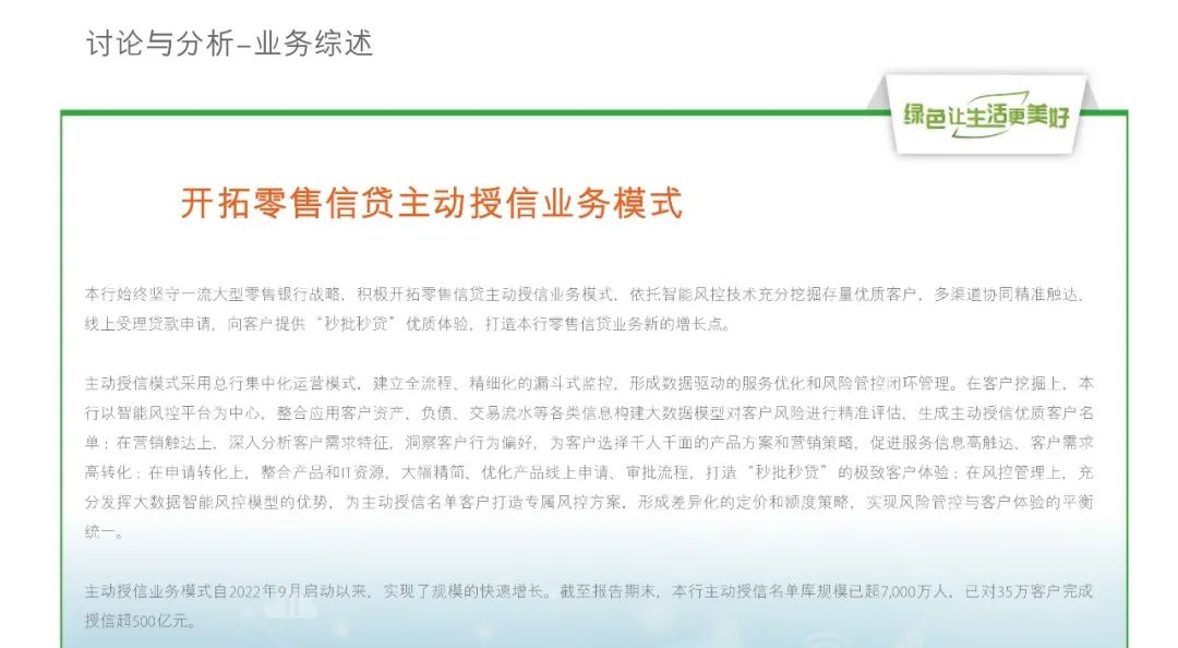 在零售風(fēng)控領(lǐng)域,該行研發(fā)主動(dòng)授信模式,深度挖掘優(yōu)質(zhì)存量客戶,提供秒批秒貸服務(wù),實(shí)現(xiàn)風(fēng)險(xiǎn)管控與客戶體驗(yàn)的平衡統(tǒng)一;推進(jìn)零售信貸自動(dòng)化審批,降低分支機(jī)構(gòu)信貸審批人員工作量一半以上,穩(wěn)步提升客戶質(zhì)量。