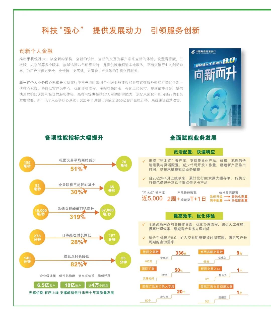 2022年,郵儲(chǔ)銀行新一代個(gè)人業(yè)務(wù)核心系統(tǒng)全面上線,從IT基礎(chǔ)設(shè)施、系統(tǒng)軟件、企業(yè)級(jí)技術(shù)平臺(tái)、應(yīng)用軟件全層面全體系,從業(yè)務(wù)創(chuàng)新、系統(tǒng)研發(fā)、生產(chǎn)運(yùn)營(yíng)全過(guò)程全周期,實(shí)現(xiàn)關(guān)鍵技術(shù)自主可控,同時(shí)也是大型銀行中率先同時(shí)采用企業(yè)級(jí)業(yè)務(wù)建模和分布式微服務(wù)架構(gòu)打造的全新一代核心系統(tǒng)。