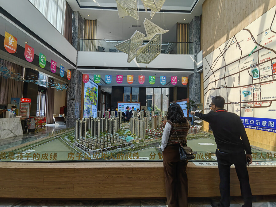 惠城區(qū)某樓盤營(yíng)銷中心內(nèi),銷售正在介紹項(xiàng)目。