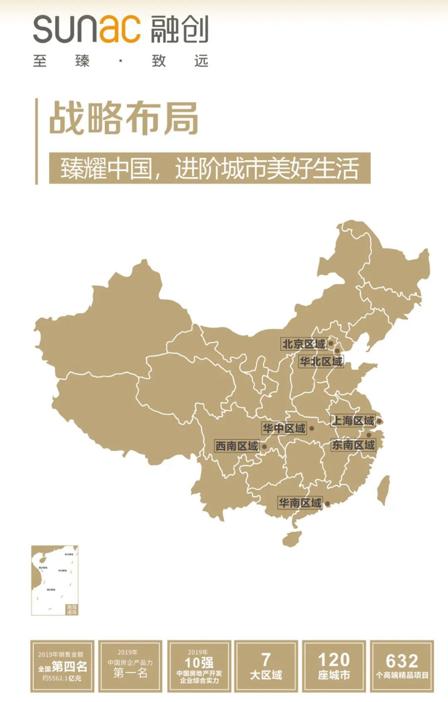 目前,融創中國在全國優勢布局了北京、華北、上海、西南、東南、華中和華南七大區域,在120多座城市擁有逾600個高端精品項目。2019年,融創中國以5562.1億元的合同銷售金額,位列全國房企銷售額排名第四位。