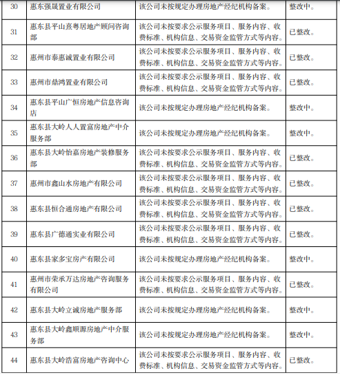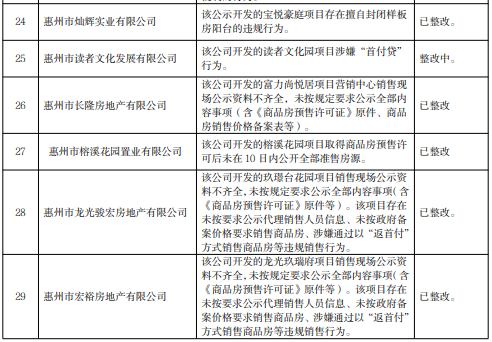 關注被通報的29家惠州企業名單,分別為惠州市讀者文化發展有限公司、惠州市榕溪花園置業有限公司、惠州市龍光駿宏房地產有限公司等6家房地產開發企業和惠東強晟置業有限公司、惠州市泰惠誠置業有限公司、惠州市斌哥說房科技有限公司等23家房地產中介機構。