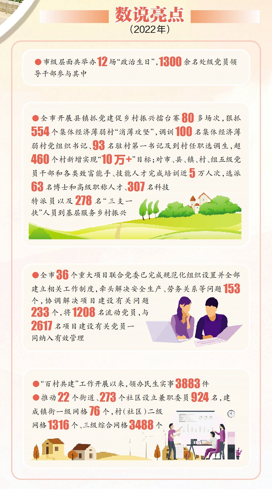 黨的建設是抓好各項工作的根本。生動活潑、亮點紛呈的黨建工作,能夠有效提升基層黨組織的組織力和黨員隊伍的戰斗力,對經濟社會發展起到強有力的推動作用。2022年,惠州堅持以習近平新時代中國特色社會主義思想為指導,深入貫徹落實新時代黨的建設總要求和新時代黨的組織路線,真抓實干、開拓創新,切實把黨的政治優勢、組織優勢轉化為推動各項工作開展的優勢,為惠州高質量發展提供了堅強組織保證。
