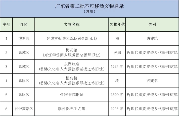 惠州新增6處省級革命文物。日前,廣東省文旅廳公布廣東省第二批革命文物名錄,69處不可移動文物、408件/套可移動文物入選。其中,惠州6處省文保單位榜上有名,即為沖虛古觀(東江縱隊司令部舊址)、梅花館(東江華僑回鄉服務團總團部舊址)、東湖旅店(香港文化名人大營救惠城接送站舊址)、榴兆樓(香港文化名人大營救惠陽接送站舊址)、崇雅書院舊址、廖仲愷先生之碑。