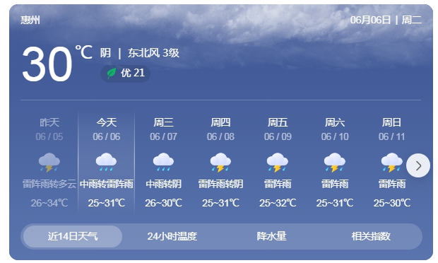 具體來說,6月6日,我市天氣多云,有雷陣雨,局部大雨到暴雨,25~33℃;7日,中到強雷雨,局部暴雨,25~32℃;8~9日,多云,有雷陣雨,局部大雨。