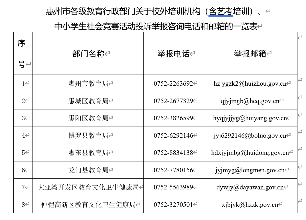 8月29日,惠州市教育局發布《關于公布惠州市中小學生校外培訓(含藝考培訓)、中小學生社會競賽活動投訴舉報咨詢電話和郵箱的公告》,凡是涉及校外培訓機構(含藝考培訓)資質、課程、師資、招生、收費、侵害未成年人身心健康等方面問題,以及面向中小學生的各類社會競賽活動問題都可以舉報。