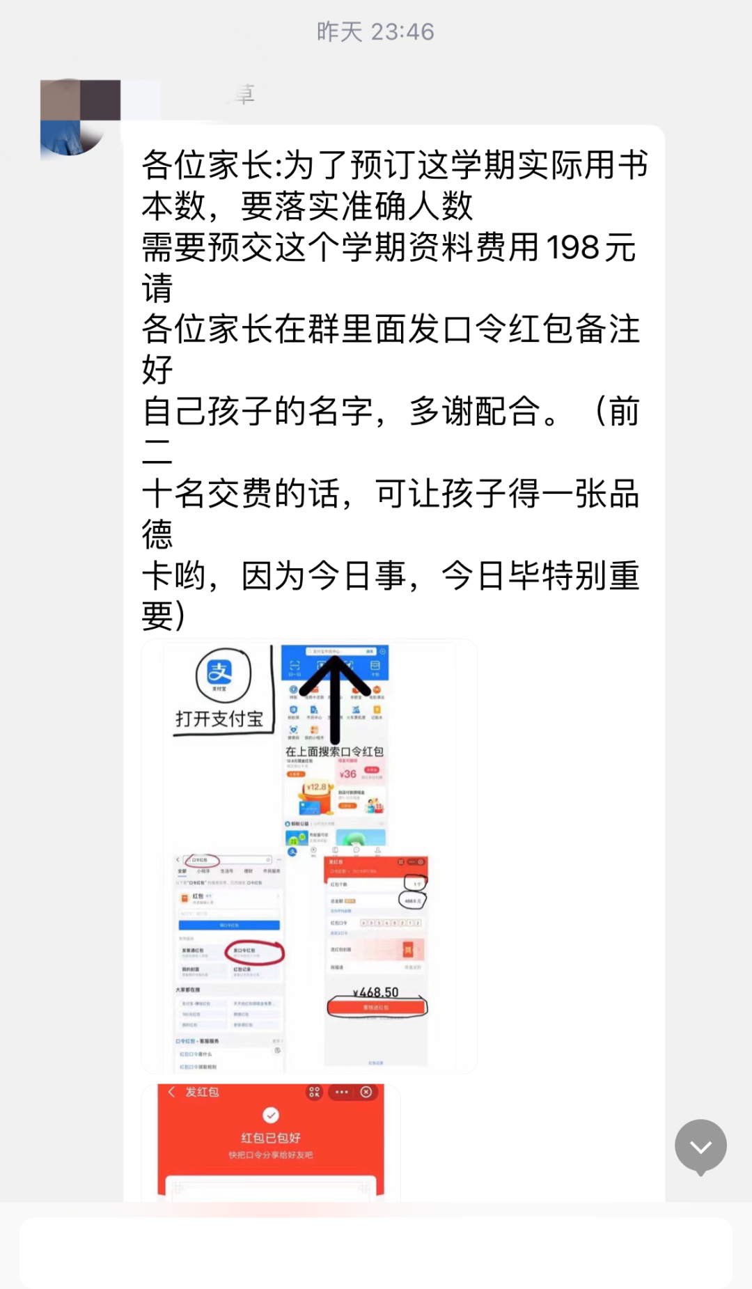 近日開學(xué)季,惠州某小學(xué)群內(nèi),騙子冒充班主任在群內(nèi)收集“學(xué)習(xí)材料費”,讓家長通過支付寶發(fā)口令紅包進行接龍。直到真正班主任的出現(xiàn),讓家長們停止繳費,大家才意識到遇到騙子了...