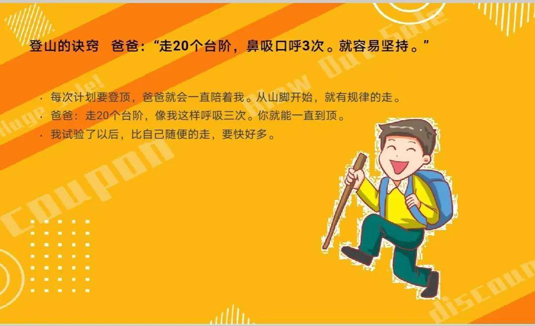 兒子的觀察力也好。十多次之后,他說:“爸爸,很少看到有爸爸帶兒子登山的,一般都是媽媽帶。”