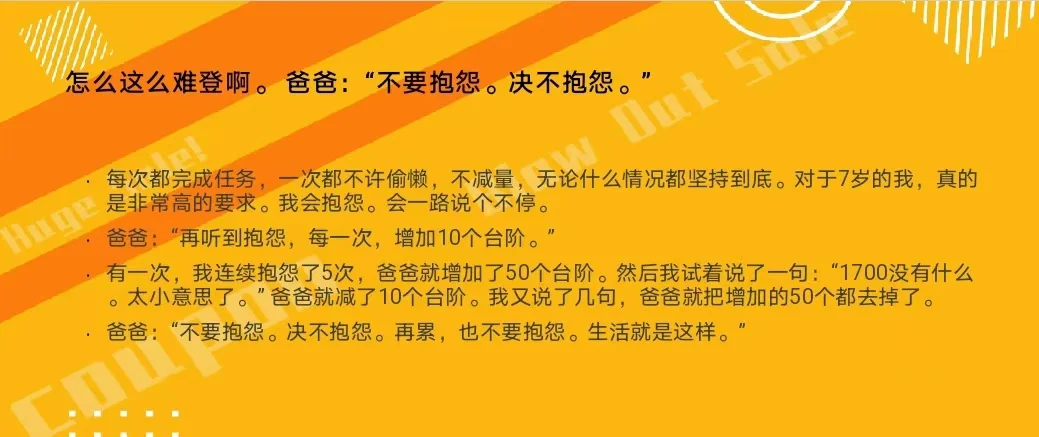 2 .每次堅持都有一定的難度。從最開始的1300米,到后來基本穩定在1700米。有四次,到頂。特別是開始的幾次,兒子一起步就說累,不想走,雙手拖著我的一只手,說不想登了。到了600米了,又開始討價還價,說,今天到1000米,就可以了。到了1300米之后,又說,到這里就可以了。到了1500米,又說,為什么以前到這里就可以了?