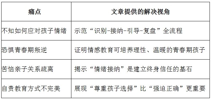 這篇文章對父母們的幫助是全方位的,它不僅能提升父母的育兒認知,更能提供可操作的實踐方法,最終改善親子關系、優化家庭氛圍。具體來說,其價值主要體現在以下兩個方面: