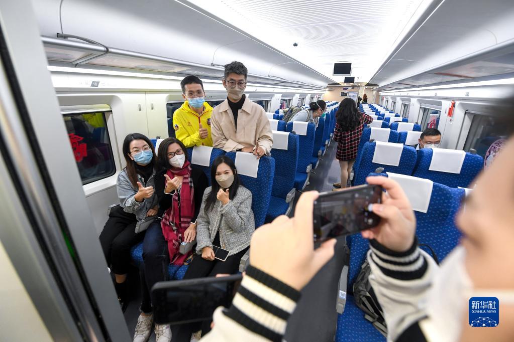 1月15日,在深圳北站,搭乘恢復(fù)通車后內(nèi)地駛往香港首趟列車G5607次的乘客在車廂里留影。新華社記者 毛思倩 攝