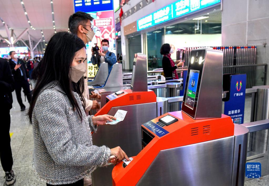 1月15日,在深圳北站,搭乘恢復(fù)通車后內(nèi)地駛往香港首趟列車G5607次的乘客通過閘機(jī)進(jìn)站。新華社記者 毛思倩 攝