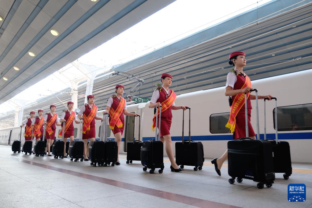 6月16日,D910次列車乘務員列隊經(jīng)過北京西站站臺。新華社記者 王申 攝