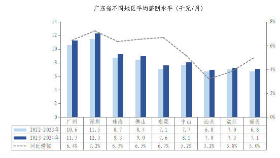 與去年相比,深圳薪酬增速全省第一,同比增長7.2%,增幅同比提高0.7個百分點(diǎn)。其次是廣州、珠海、佛山、東莞,同比增長在6%~7%之間。再次是中山、韶關(guān),同比增長5%左右。湛江、汕頭較低,同比增長不足4%。