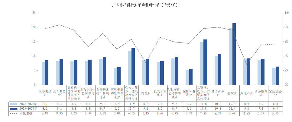 與去年相比,汽車制造業(yè),電子商務(wù)業(yè),設(shè)備制造業(yè),互聯(lián)網(wǎng)、軟件、IT服務(wù)和信息傳輸業(yè),計(jì)算機(jī)、通信和其他電子產(chǎn)品制造業(yè),醫(yī)藥和生物工程制造業(yè)平均薪酬增長較為明顯,分別為8.3%、8.0%、7.8%、7.8%、7.6%、7.1%,其中四個行業(yè)為制造業(yè),可見廣東制造業(yè)“壓艙石”“頂梁柱”作用日漸凸顯;而房地產(chǎn)業(yè)、建筑業(yè)受宏觀調(diào)控政策影響,行業(yè)薪酬增長持續(xù)放緩,同比分別增長2.8%、3.1%。