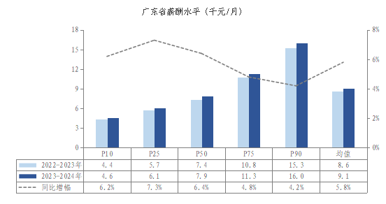 全省薪資增幅與經(jīng)濟(jì)預(yù)期走勢基本一致。根據(jù)報(bào)告,廣東省2023-2024年度平均月薪為9100元,同比增長5.8%,與全省2023年地區(qū)生產(chǎn)總值預(yù)期增長5%以上的態(tài)勢基本一致。從分位值來看,較低分位值同比增幅高于較高分位值,即低收入群體薪酬增長更加明顯,勞動者收入分配差距呈收窄趨勢,側(cè)面反映出全省扎實(shí)推進(jìn)共同富裕取得一定成效。