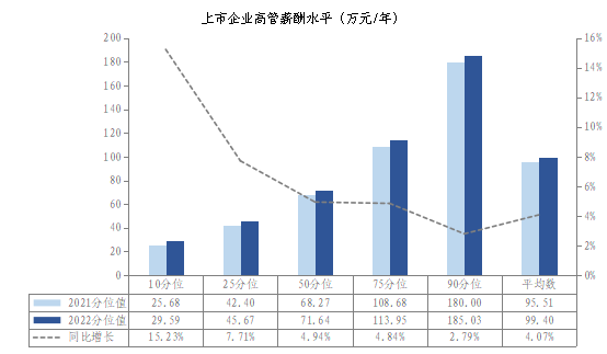 具體來看,分位數(shù)越高,增幅越小,P10、P25、P50、P75、P90同比分別增加15.23%、7.71%、4.94%、4.84%、2.79%,可見高管薪酬差距逐步縮窄。