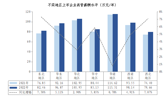從地區(qū)分布來看,各地區(qū)高管薪酬水平同比均有不同程度的提升。其中,華南地區(qū)上市企業(yè)高管薪酬依然處于領(lǐng)先地位,平均年薪為115.51萬元/年,同比增長0.78%;華北地區(qū)保持第二,平均年薪為105.93萬元/年,同比增長2.90%,增幅較去年相比有所放緩;西南地區(qū)仍位居第三,為98.14萬元/年,同比增長4.91%,增幅與去年基本一致;東北地區(qū)與西北地區(qū)的薪酬水平雖然在地區(qū)中排名靠后,但增幅較高,分別為7.30%、7.07%。