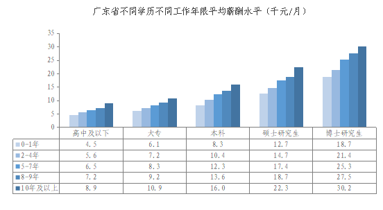 高學(xué)歷人才薪酬優(yōu)勢顯著,人才總量聚集效應(yīng)凸顯。總體來看,廣東省職工薪酬水平與學(xué)歷、工作年限均呈正相關(guān)關(guān)系,即職工的學(xué)歷越高、工作年限越長,平均薪酬水平越高。
