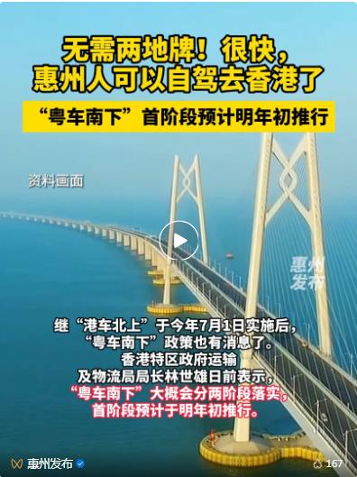 香港特別行政區運輸及物流局局長日前表示,“粵車南下”大概會分兩階段落實,首階段預計于明年初推行。