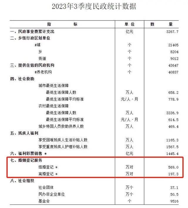 11月10日,民政部網站發布了《2023年3季度民政統計數據》,據統計,今年前三季度,全國辦理結婚登記為569.0萬對,辦理離婚登記197.3萬對。2022年前三季度,全國共辦理結婚登記544.5萬對,辦理離婚登記164.3萬對。相較而言,今年前三季度結婚登記量較去年同期增加24.5萬對,離婚登記量同比增加33萬對。