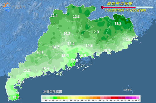 21日,廣東全省晴天,早晨最低氣溫:中北部市縣10~13℃,南部市縣13~17℃。