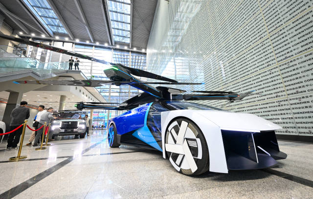 11月15日,在第二十五屆高交會上,搭載了人工智能大模型系統的小鵬匯天陸空一體式飛行汽車對公眾展出。新華社發