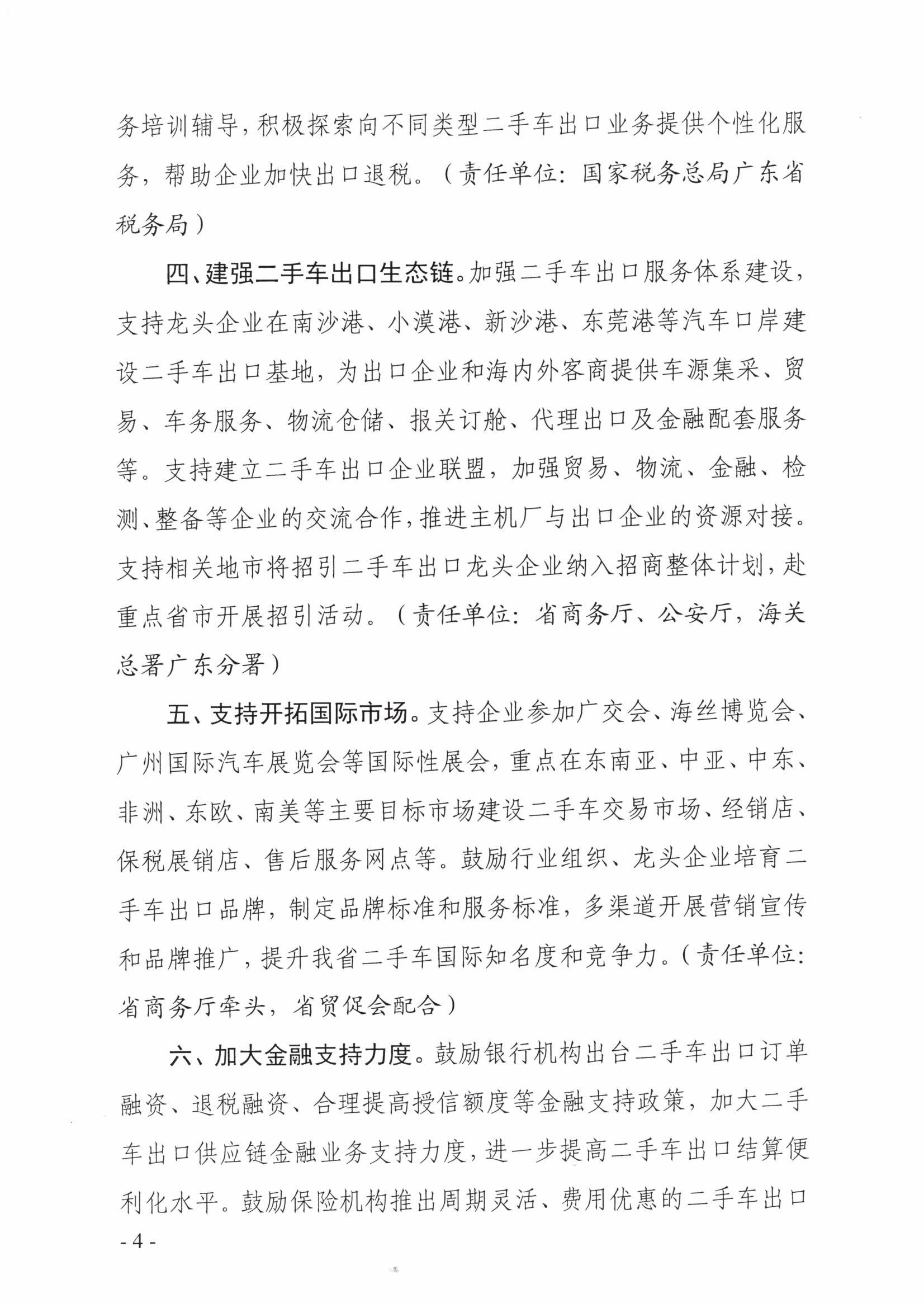 據廣東省商務廳網站消息,近日,廣東省商務廳等10部門制定并印發《廣東省促進二手車出口若干措施》(以下簡稱《措施》),提出提升車輛過戶、注銷等便利化水平;優化二手車出口流程;提高出口退稅效率;建強二手車出口生態鏈;支持開拓國際市場;加大金融支持力度;建立省市共促政策體系;完善信息服務平臺等8項措施,加快推動廣東省二手車出口高質量發展。其中,《措施》提出,廣東二手車出口退稅辦理時間最短將壓縮至3個工作日內,支持龍頭企業在南沙港、小漠港、新沙港、東莞港等汽車口岸建設二手車出口基地。