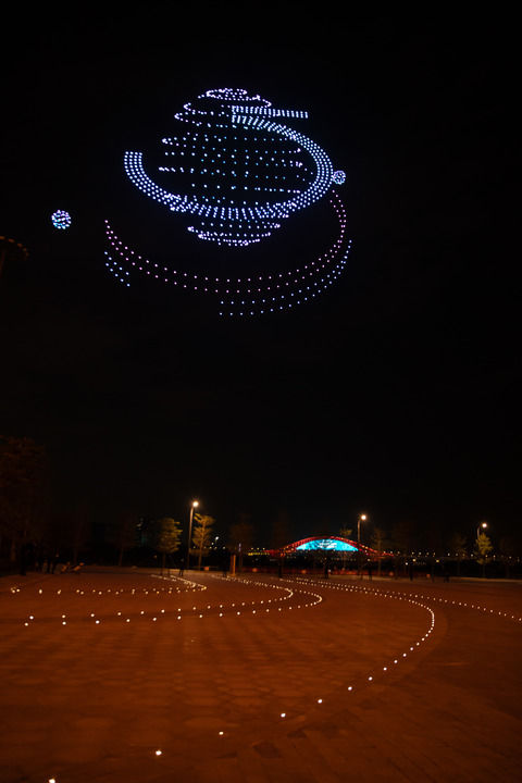 這是12月2日晚在廣州南沙國際金融論壇永久會址拍攝的世界媒體峰會無人機表演。新華社記者 金立旺 攝