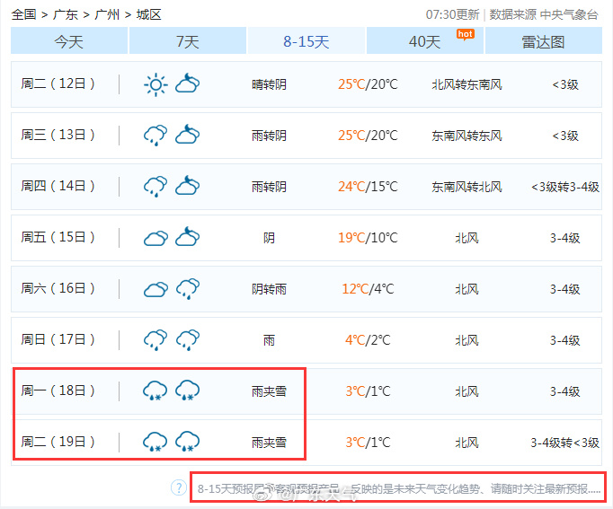 昨天,不少網友從“8-15天趨勢預報”中發現廣州12月中下旬有雨夾雪。