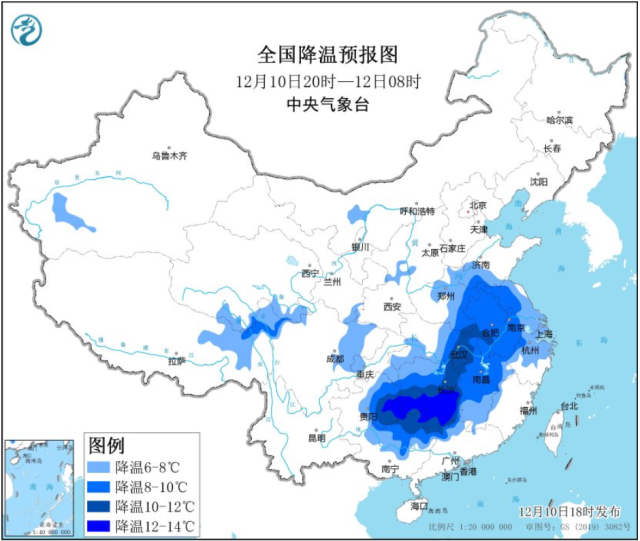 預計,受強冷空氣影響,12月11日至12月12日8時,西藏東北部、川西高原北部、黃淮南部、江淮、江漢東部、江南中西部、貴州東部、華南北部等地大部將先后降溫6℃-8℃。山西南部、河南北部、遼寧東南部等地的部分地區有暴雪。