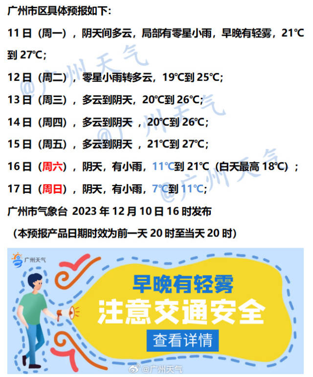 按廣州市氣象臺的一周天氣預測看,16日(周六)、17日(周日)廣州最低氣溫將從前一天的20℃左右驟降至7℃-11℃。大家可以提前準備起防寒的衣物了。